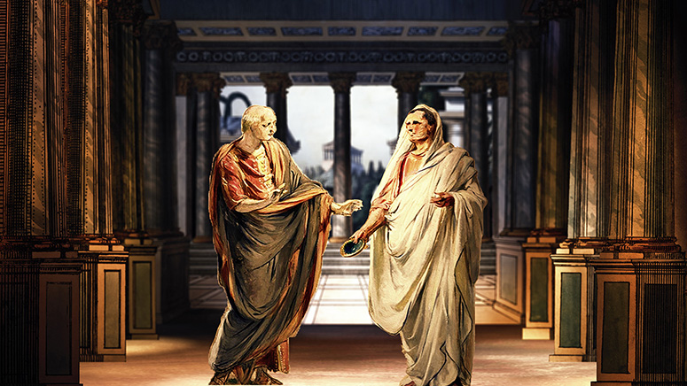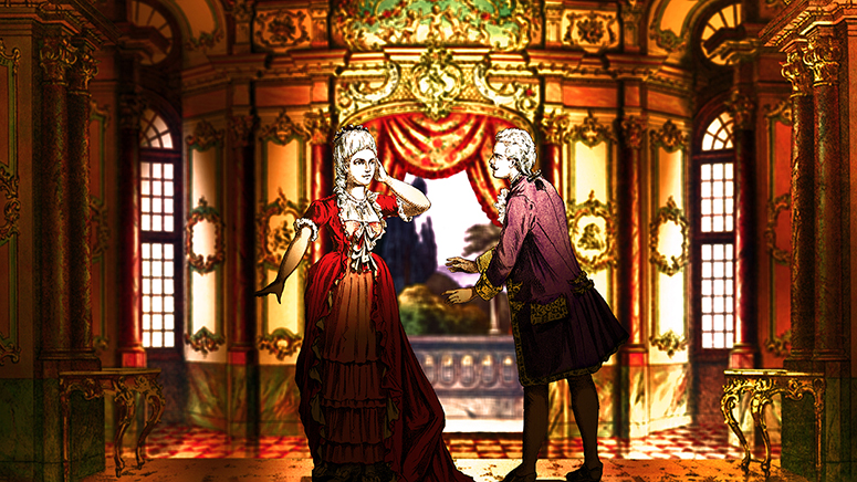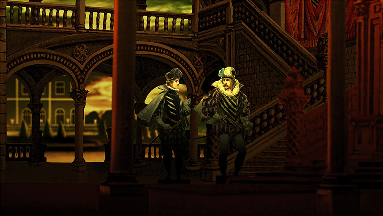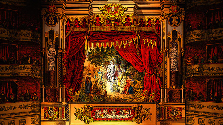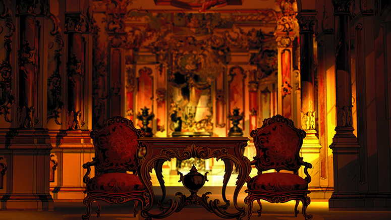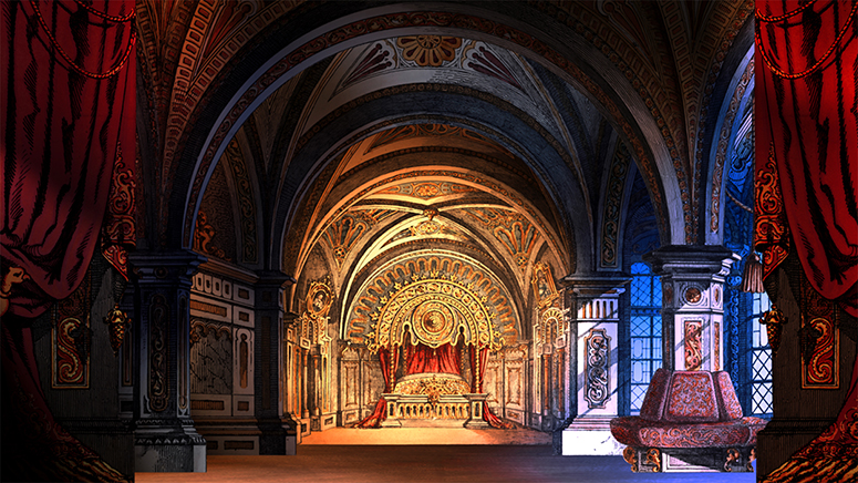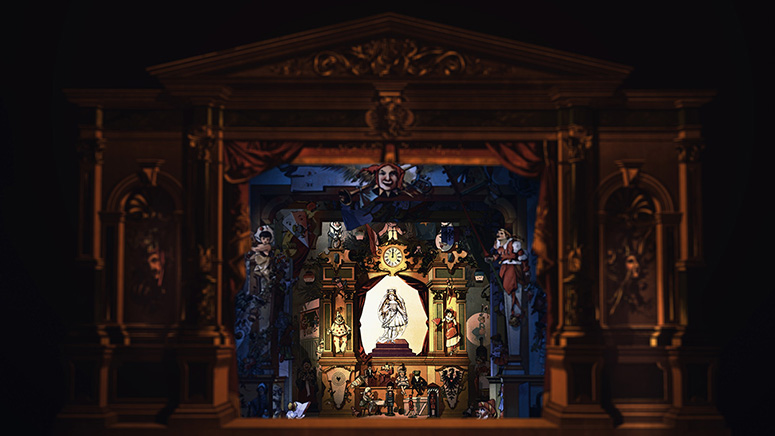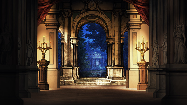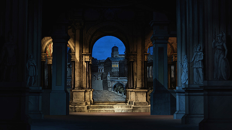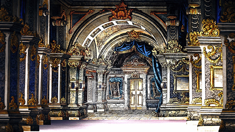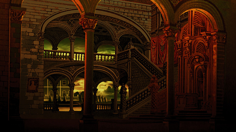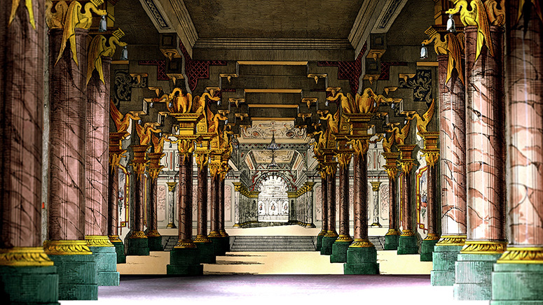 Die Säulenhalle von Schreiber als Abschluss des Raums zur Stadt. Die Kerzenständer stammen aus dem fürstlichen Zimmer von Scholz. Die anderen Gassen sind von verschiedenen Papiertheaterdekorationen von Trentsensky, die in Photoshop erweitert wurden. Weitere Informationen
