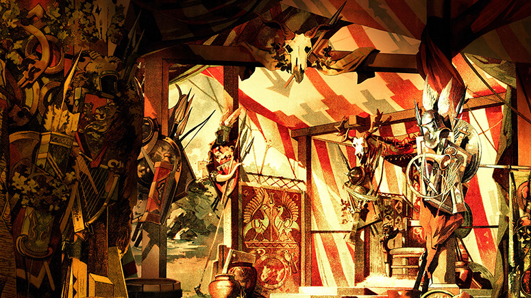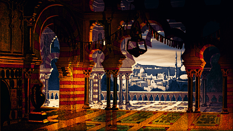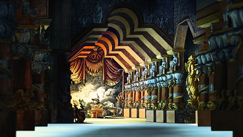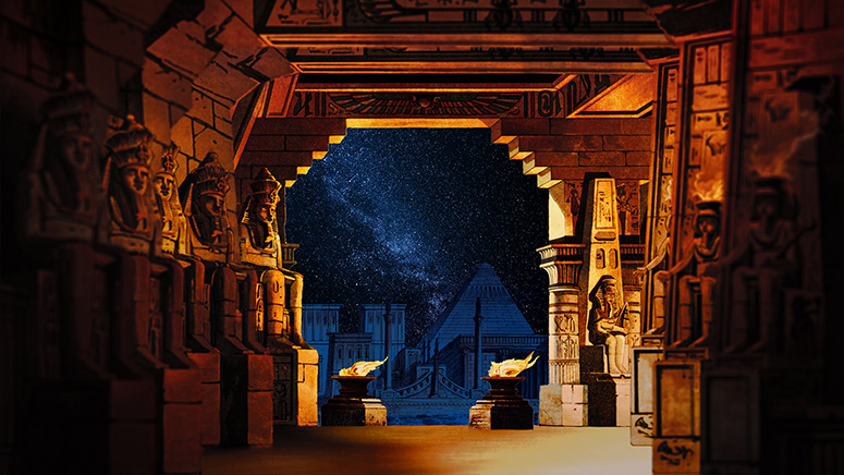 Dieses Bühnenbild besteht aus Schreibers ägyptischem Tempel im Vordergrund und Memphis von Trentsensky im Hintergrund. Der Himmel wurde ausgeschnitten und durch einen eigenen ersetzt. Weitere Informationen