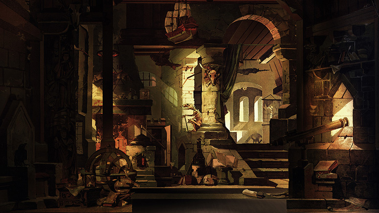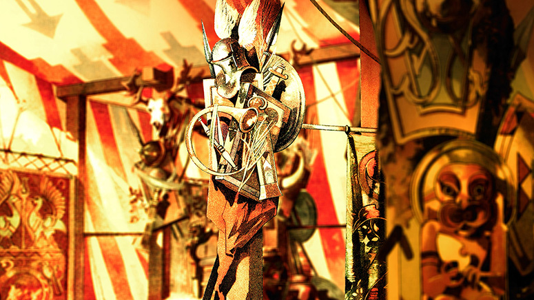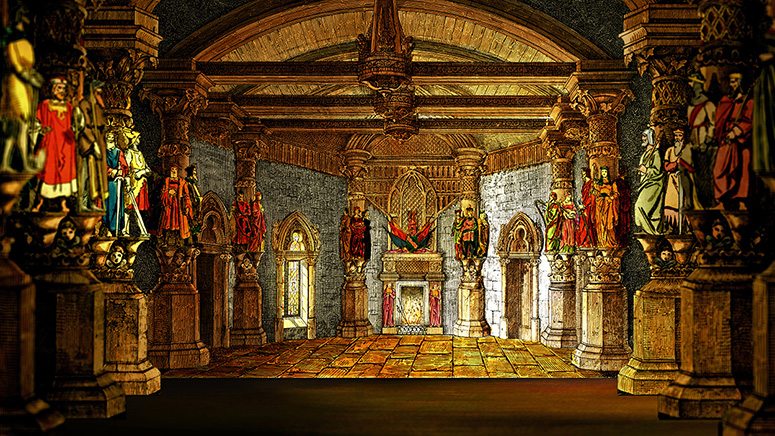 Der gotische Saal von Trentsensky. Der Hintergrund dieser Papiertheaterdekoration wurde ausgeschnitten und als Durchbruch verwendet. Auch der eigentliche Hintergrund wurde ausgeschnitten. Dahinter steht eine Landschaft von Trentsensky, deren Himmel ersetzt wurde. Weitere Informationen
