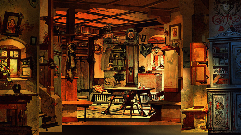 Fotos von Papiertheaterbühnenbildern mit folgenden Motiven: Bauernstuben, Faust-Zimmer, Hexenküchen, Zauberkabinette, Kerker, Gefängnisse, Kirchenräume, Rittersäle, Prunkräume, Wohnzimmer und Salons.