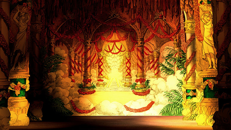 Der Feentempel von Trentsensky. Der Hintergrund wurde verdoppelt und einmal als Durchbruch verwendet. Der Himmel dieser Papiertheaterdekoration wurde ersetzt.