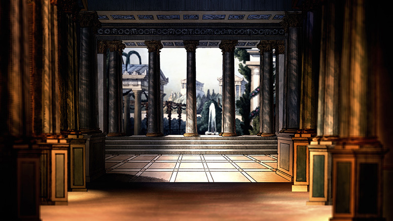Die Säulenhalle von Schreiber als Abschluss des Raums zur Stadt, diesmal bei Tag. Die anderen Gassen sind von verschiedenen Papiertheaterdekorationen von Trentsensky, die in Photoshop erweitert wurden. Weitere Informationen