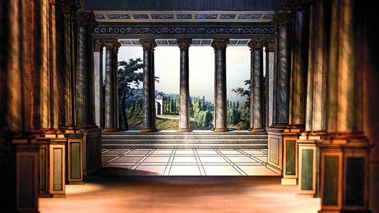 Römisches Peristyl von Trentsensky. Der Himmel wurde ersetzt. Die vorderen Säulen stammen von der Trentsensky-Dekoration römische Halle. Weitere Informationen