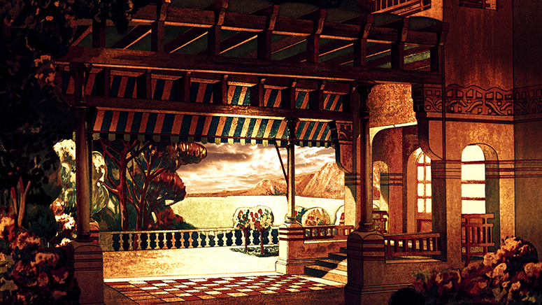 Die Villa mit Terrasse von Seix y Barral. Bei dieser Papiertheaterdekoration wurde nur der Himmel ersetzt. Weitere Informationen
